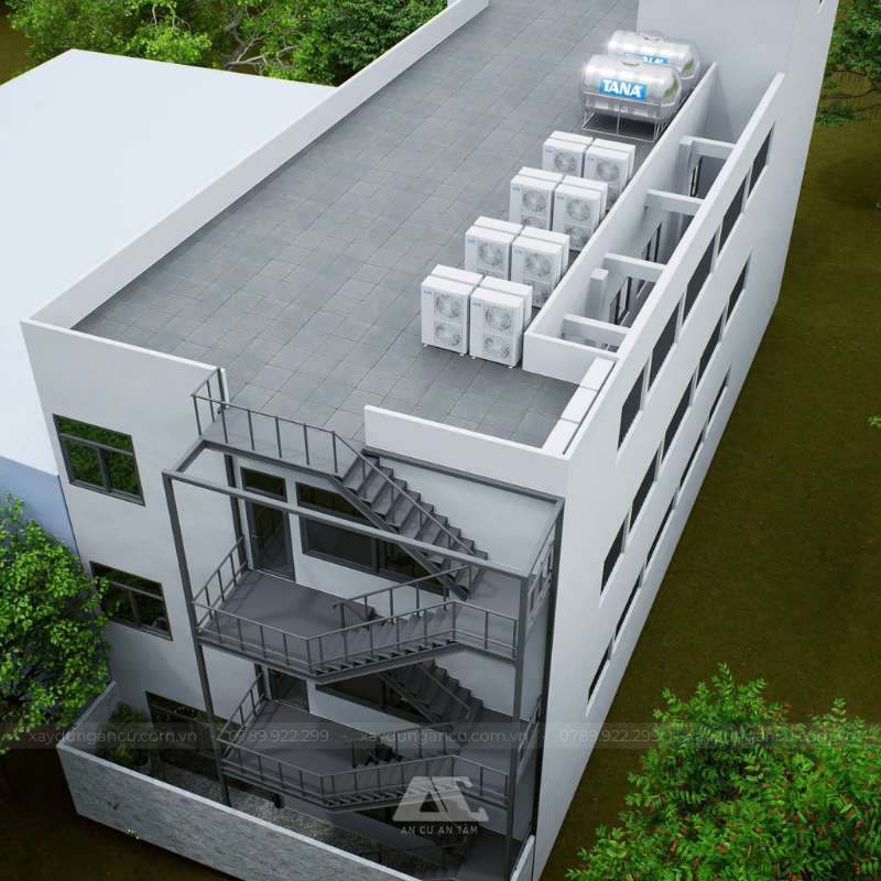 Giải pháp thiết kế thi công căn hộ dịch vụ từ An Cư mang đến vẻ đẹp hiện đại, tập trung tối ưu hóa công năng nhằm đảm bảo sự tiện nghi cao nhất cho khách thuê. Công trình sở hữu kết cấu bền vững, tuân thủ nghiêm ngặt các tiêu chuẩn an toàn với hệ thống thang thoát hiểm bố trí bên ngoài. Khu vực mái được quy hoạch khoa học để lắp đặt hệ thống kỹ thuật (bồn nước, điều hòa), giúp vận hành tòa nhà hiệu quả. Tổng thể kiến trúc đi theo hướng tối giản nhưng tinh tế, hài hòa với mảng xanh xung quanh để kiến tạo một không gian sống thoáng đãng và dễ chịu.